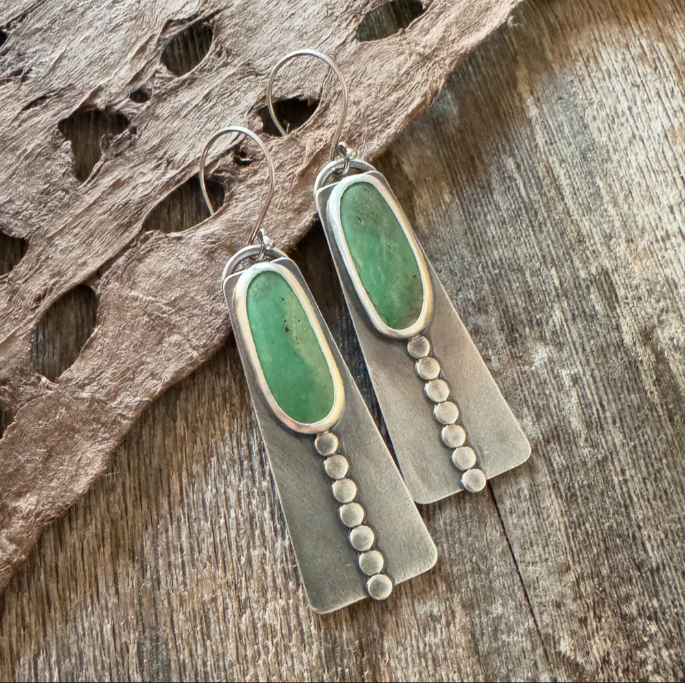 Statement-making but easy to wear, these one-of-a-kind long turquoise earrings feature Elisa turquoise framed in sterling silver. A row of hand-applied silver discs adds texture and contrast — just the right amount of detail, simple and thoughtful.