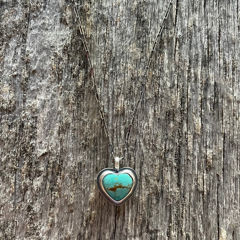 Sterling Silver and Kingman turquoise heart pendant on a fun small rectangle linked chain. Pendant just under 1” long and approx 7/8” at it widest point. Adjustable lobster clasp closure from 16” to 18”