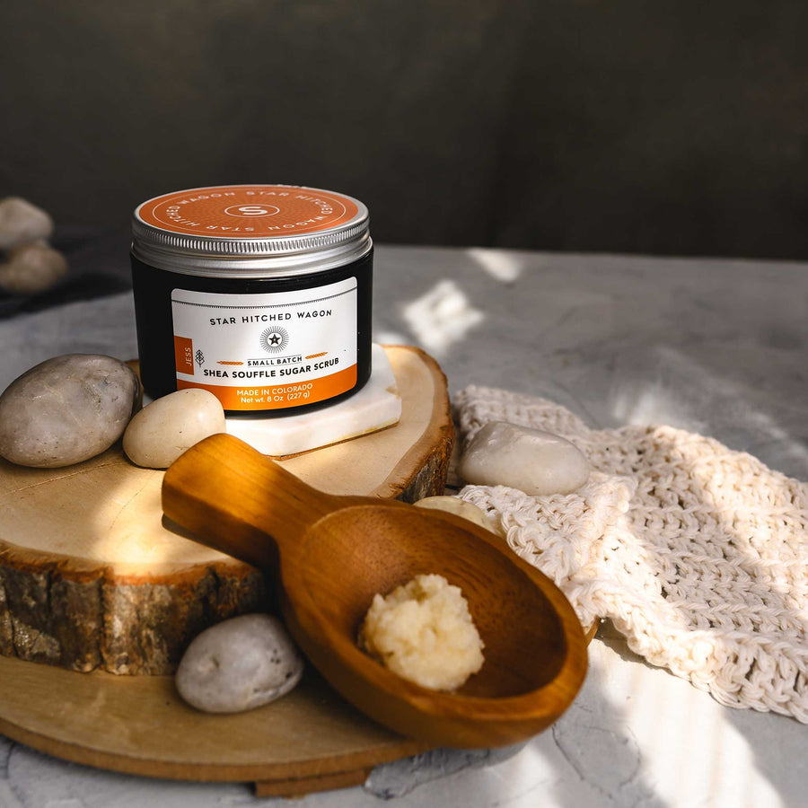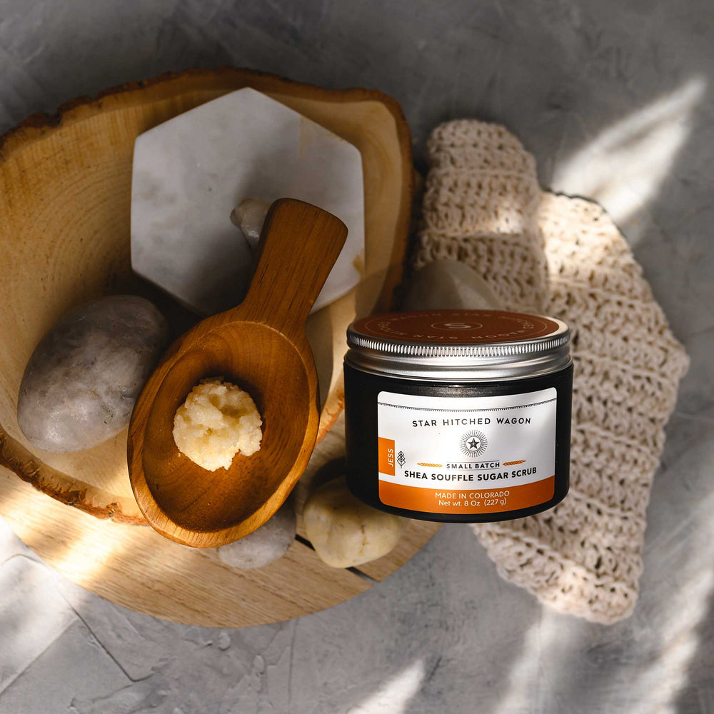 Organic shea and mango butters along with oils of safflower, argan and jojoba are whipped to flawless perfection with just enough organic fair trade sugar to create the lushest mix of gentle exfoliation and ultimate moisturization. Each batch is infused with all-natural essential oils that are sure to take you away to your happy place.