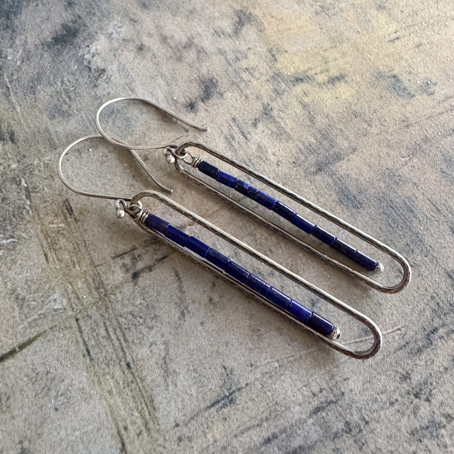 Sleek, minimal, and effortlessly bold. Deep blue Lapis tubes wrapped in hand-formed sterling silver frames. Approx. 2 5/8" from top of earwire to bottom of frame.
