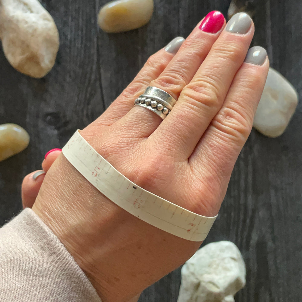 This set includes two slimmer sterling silver bangles (12 gauge) and one with a bit more heft (10 gauge). Each is hammered by hand for texture and character. Worn together, they give off a soft, familiar jingle — a little movement, a little charm, and a lot of presence.