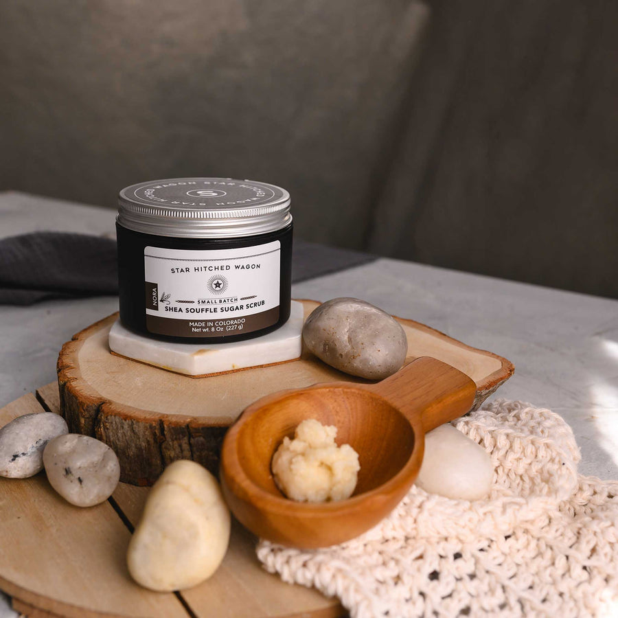 Organic shea and mango butters along with oils of safflower, argan and jojoba are whipped to flawless perfection with just enough organic fair trade sugar to create the lushest mix of gentle exfoliation and ultimate moisturization. Each batch is infused with all-natural essential oils that are sure to take you away to your happy place.