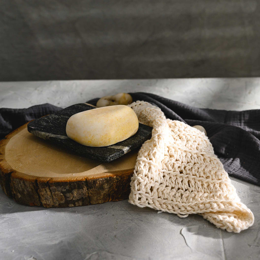 Get ready to elevate your sink or shower space with our beautiful river stone salt soap bar. Each one is unique, just like the rocks that are polished by cold, mountain streams. We use a combination of sea salt, coconut oil and Safflower, Argan and Jojoba oils to nourish and exfoliate the skin.