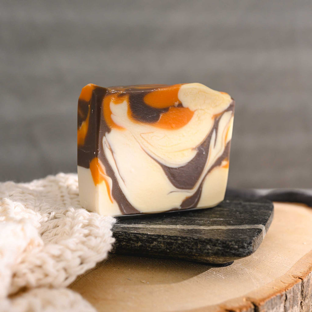 Jess essential oil soap bar with a swirl pattern of orange, brown, and cream colors, placed on a wooden surface with a cream colored knitted washcloth beside it.