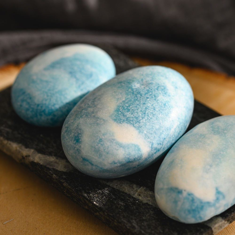 Kate river stone salt soap trio with a blue tint, placed on a rustic wooden dish, with a dark cloth in the background.