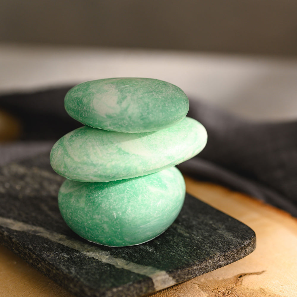 Get ready to elevate your sink or shower space with this beautiful river stone salt soap trio. Each one is unique, just like the rocks that are polished by cold, mountain streams. I use a combination of sea salt, coconut oil and Safflower, Argan and Jojoba oils to nourish and exfoliate the skin.