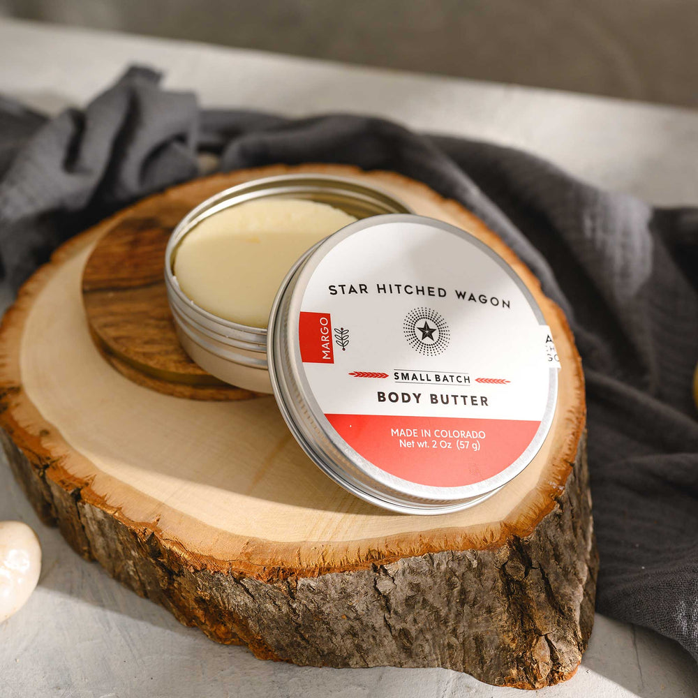 Margo body butter moisturizer in reusable tin, handcrafted with rich oils and butters to soothe dry skin. Scented with citrus, herbs, and spruce.