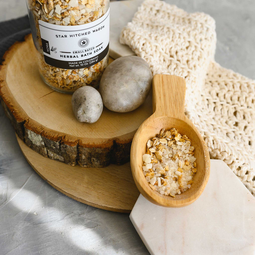 Nora’s All Natural Herbal Soak is 10 ounces of warm sweet citrus...salts, oatmeal, citrus peels, milk powders, herbs and essential oils.  All carefully selected for mind and body benefits.