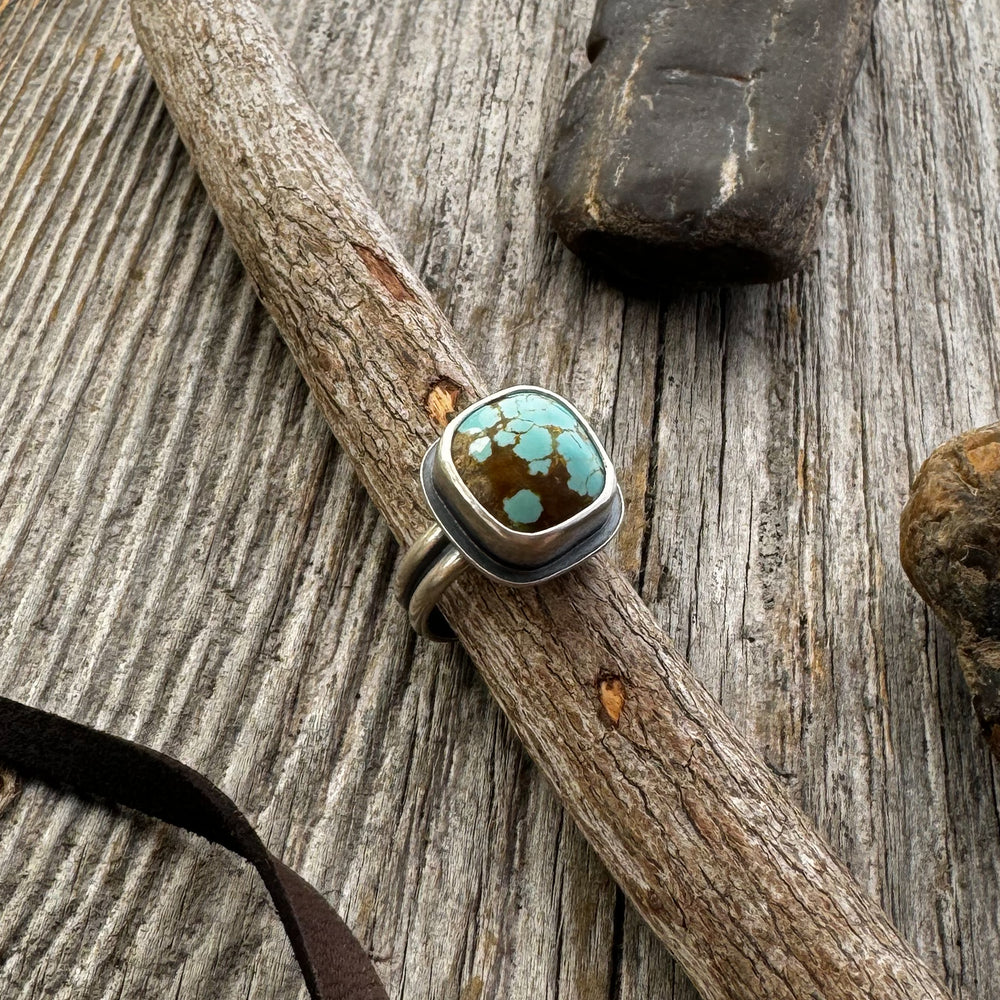 Each genuine turquoise stone — square or rectangular — is completely one of a kind. You’ll choose your favorite from the available options, and the matrix and color will guide the final look of your custom ring. Wrapped in fine silver and set on a solid two-line sterling band, this piece is made by hand in my Colorado studio.