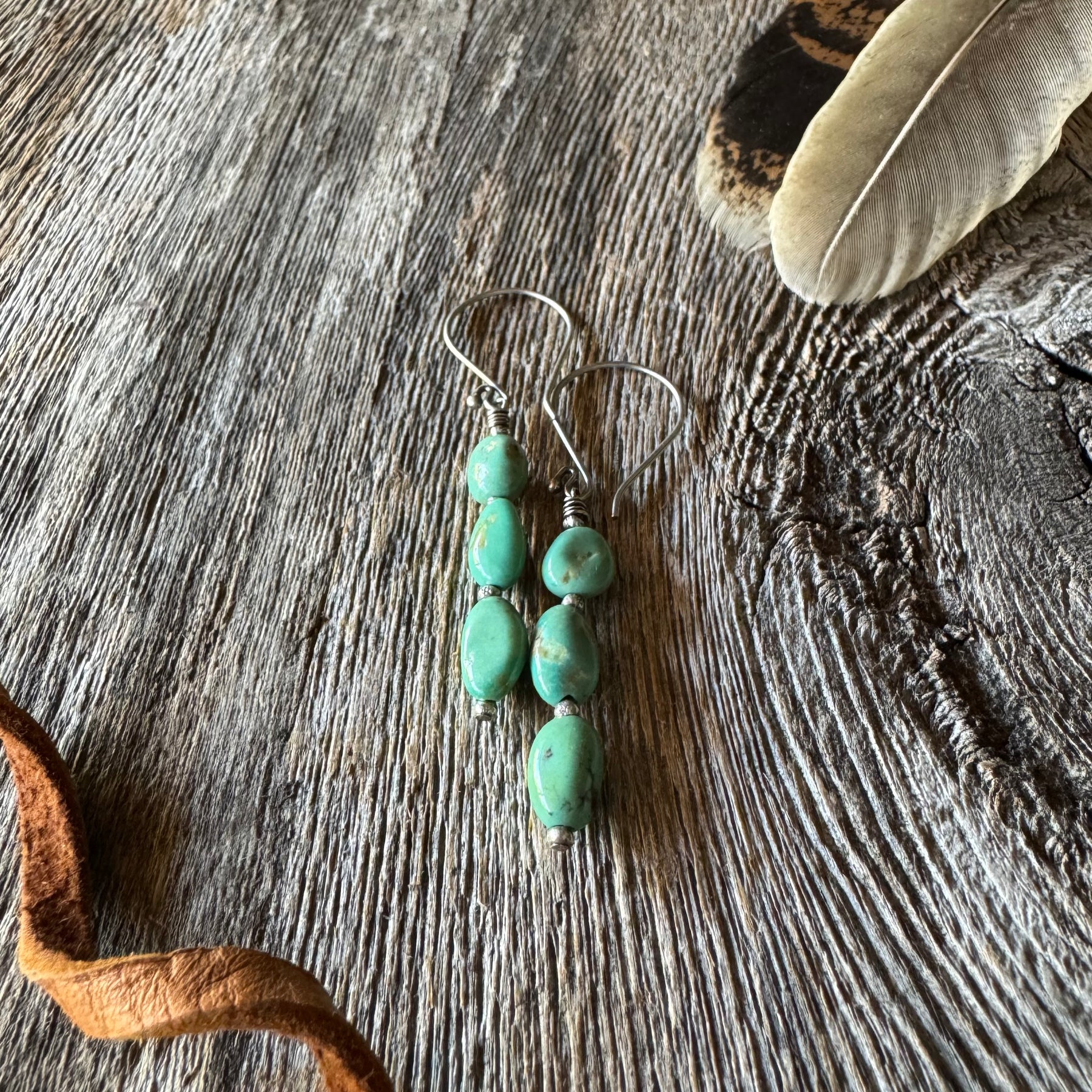 Eliza turquoise nuggets paired with sterling silver ear wires. Each stone shows its own natural character, with subtle shifts in color and matrix that make every pair unique. Lightweight and easy to wear, they’re a natural match to the Sage Creek Necklace or beautiful on their own.