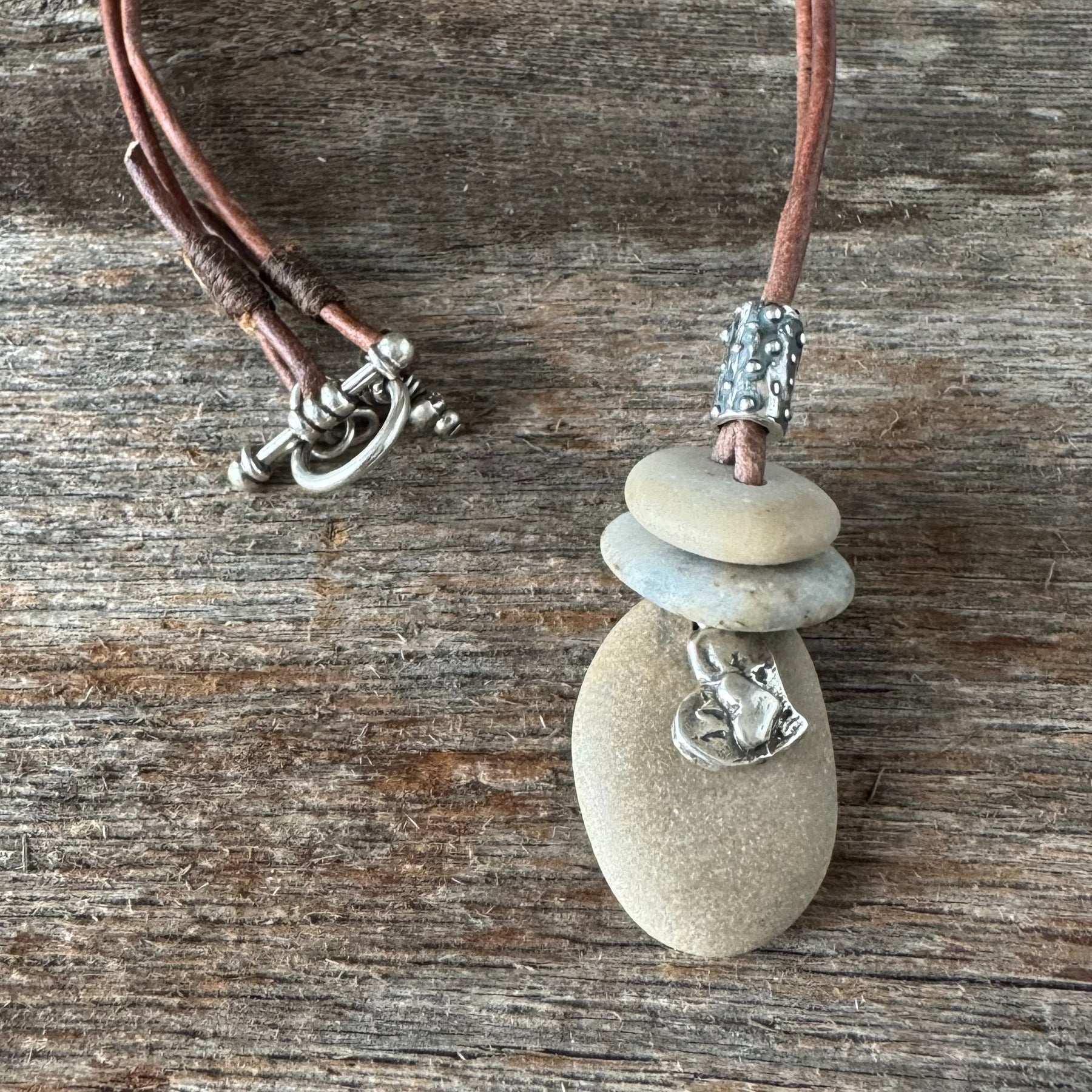 Beach pebbles with sterling silver heart charm and dotted tube on brown leather cord. Toggle clasp closure. Approx. 20” end to end.