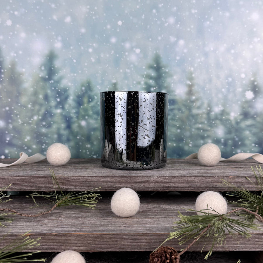 10 ounce Winter’s Den coconut soy wooden wick candle.  Notes of citrus peels, green moss, branches, paprika, cloves, tobacco leaves, figs, rum, cedarwood, oakmoss and wet stone. Stunning metallic charcoal colored mercury glass style vessel.