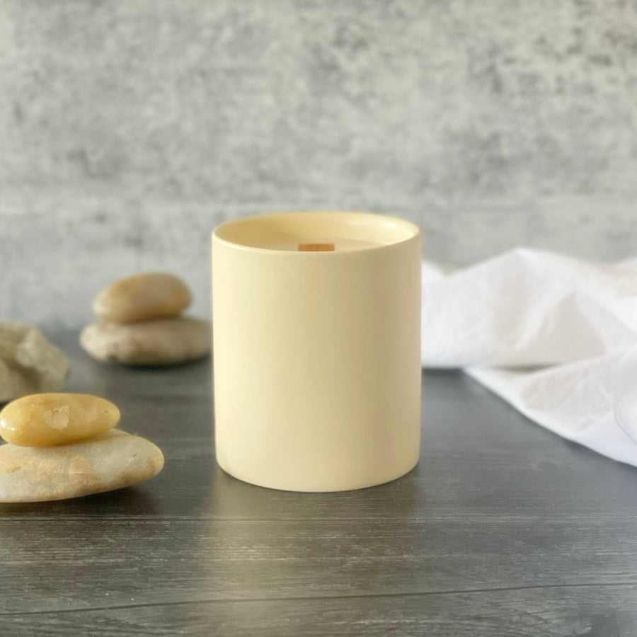 Hand poured 13 ounce coconut soy candle with wooden wick in Coconut Lemon Cake. Notes of lemon, coconut, sugar, vanilla, melted butter and baking cake.