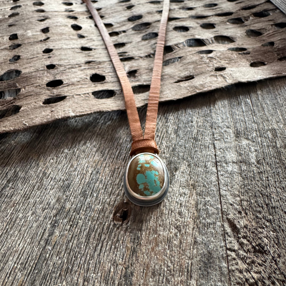 #8 Turquoise in sterling silver setting on leather lace.
