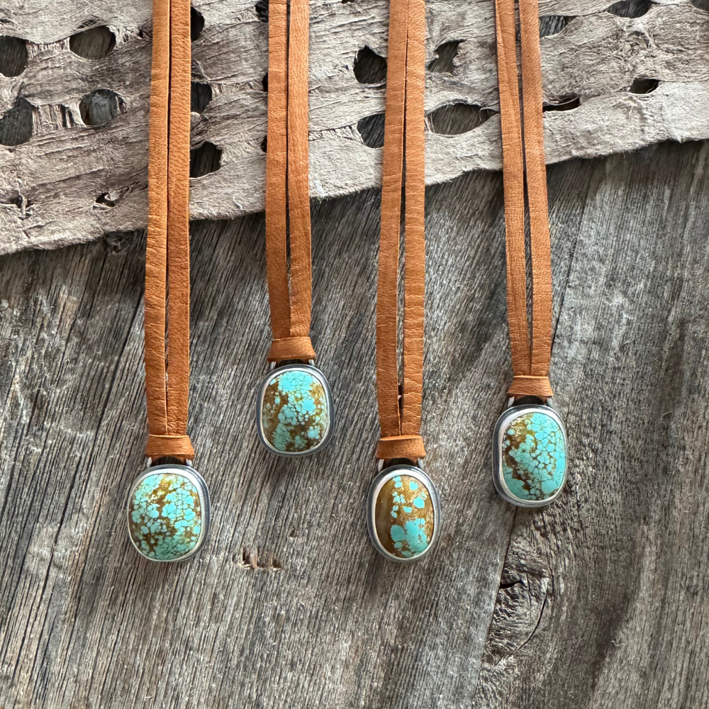 #8 Turquoise in sterling silver setting on leather lace.