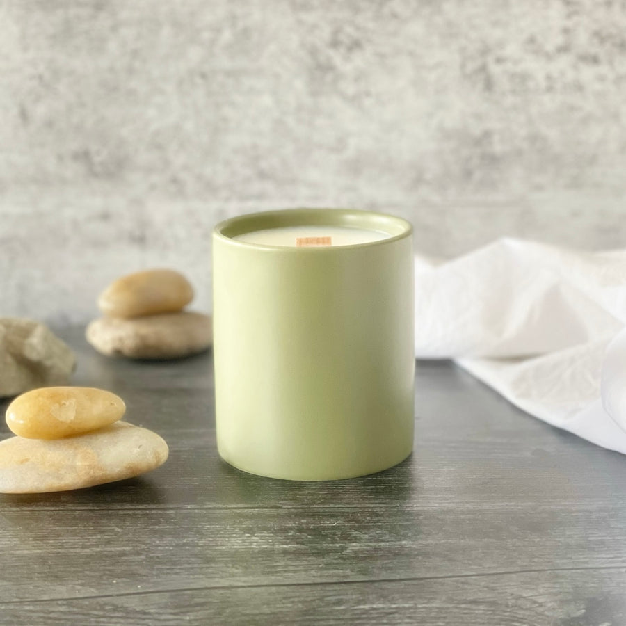Hand poured 13 ounce coconut soy candle with wooden wick in Fresh Herbal Mint. Notes of mint, basil, citrus, sage cedar and a hint of musk.