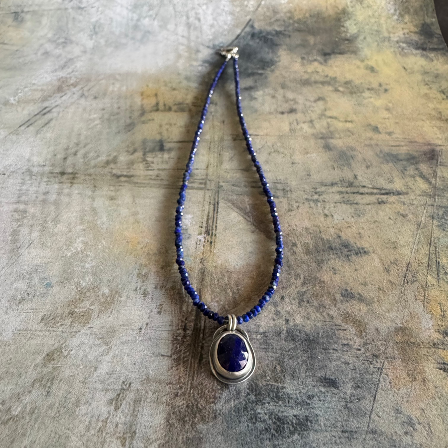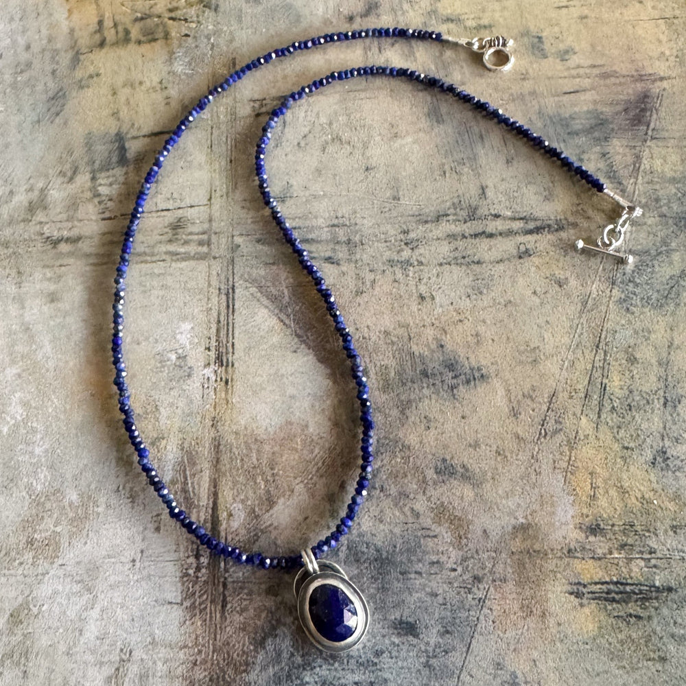 A faceted Lapis stone set in sterling silver is suspended from a continuous strand of tiny faceted lapis rondelles.