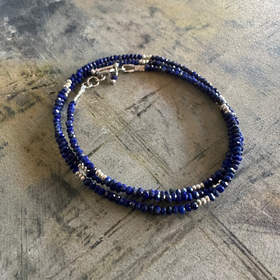 Deep blue faceted Lapis rondelles and Thai silver with Bali silver toggle clasp closure. Wear wrapped as a bracelet or styled as a necklace.