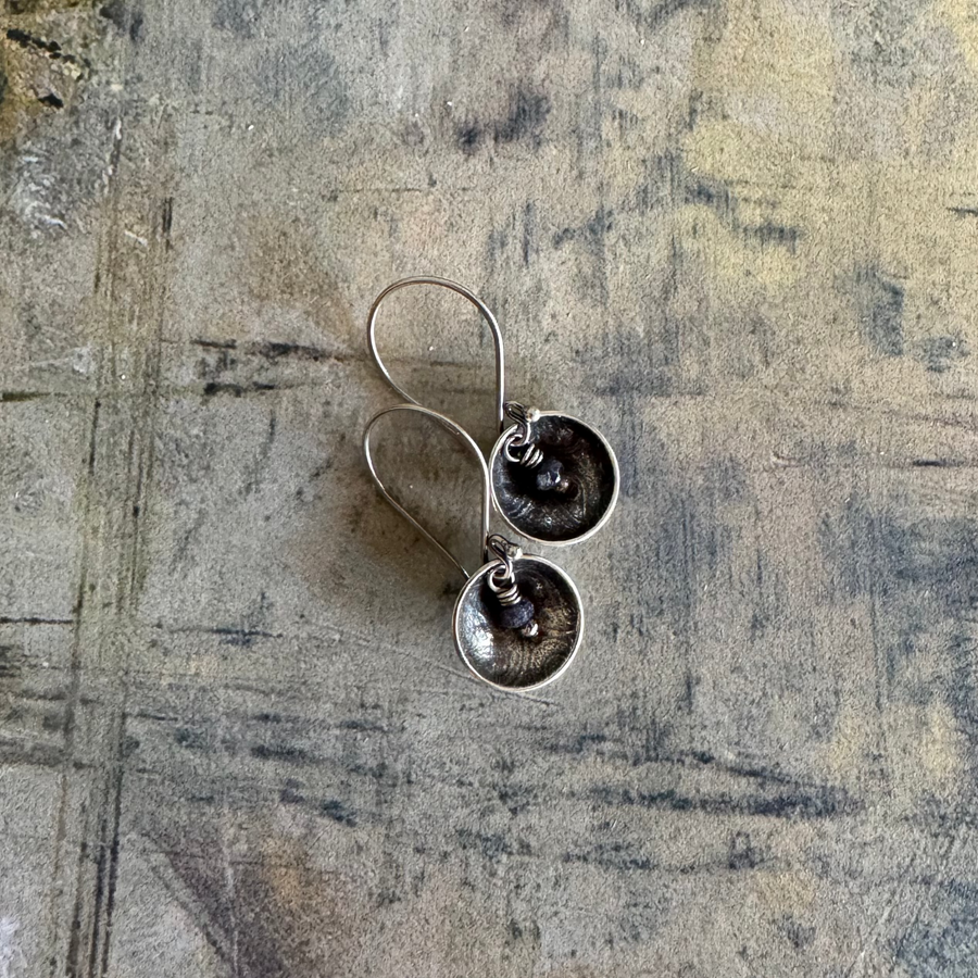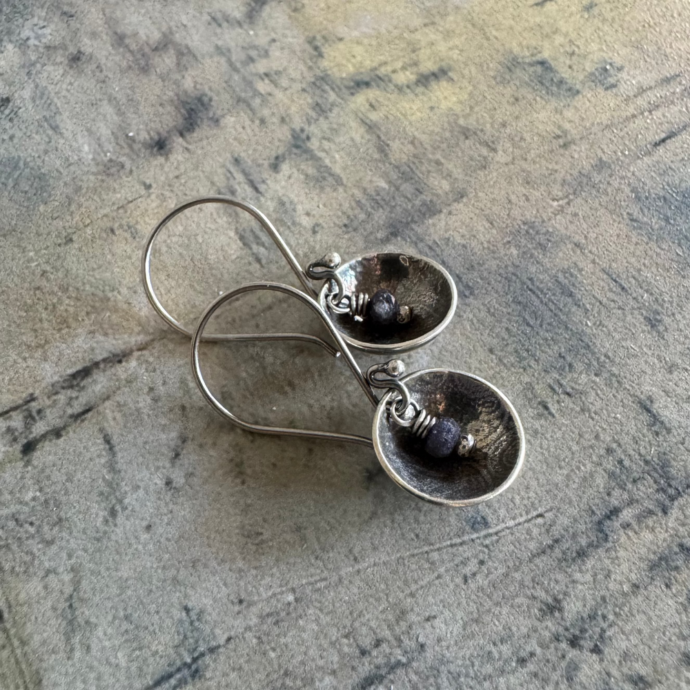 Deep sapphire stones sit at the center of embossed sterling silver concave discs.